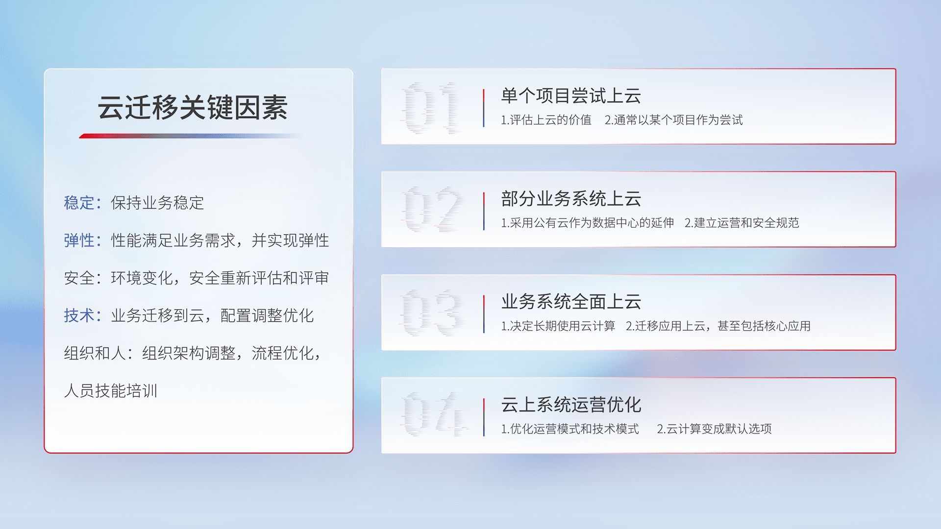 结合实际业务,,,,从规划设计、、、、云平台选型、、、云原生改造、、、、数据迁移、、、、集成交付,,,,迁移全过程为客户识别最佳上云路径,,,,做好风险识别管理,,,,设计网络架构、、、、身份权限、、、、安全审计合规、、、操作审计、、、日志审计、、、、监控告警策略、、多站点容灾设计等,,,,对云上基础设施进行整体规划,,提升IT治理水平,,以满足弹性、、、高可用、、高性能的需求。。。