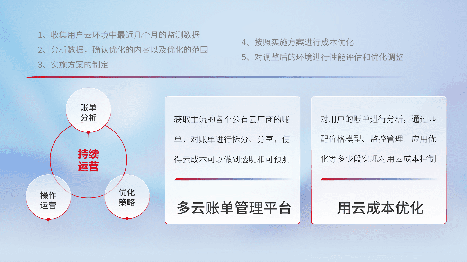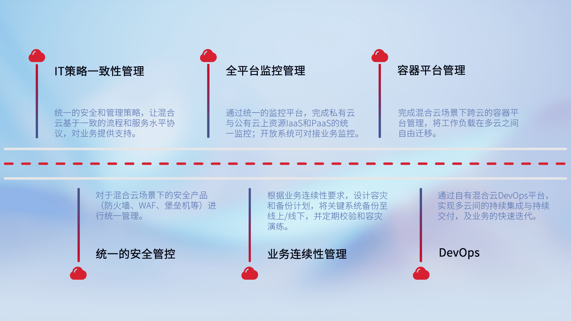 通过多云纳管,,,,以统一的资源数据模型把客户的云资源进行抽象和封装,,,,进而实现对多云资源的统一操作,,,,保障云资源管理的可靠性、、稳定性与可用性。。。。量身定制化运维内容,,,,配置、、、、开发运维、、补丁管理、、、、备份、、监控、、、、认证和访问管理、、、审计和日常巡检等,,,,保障在用云过程中的可靠度,,,稳定度以及高可用率。。。