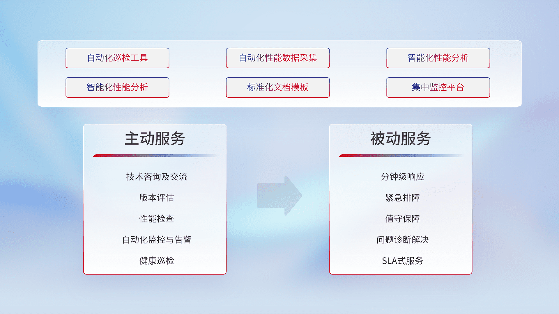 智能化工具和标准化文档,,,,保障服务质量,,,,提供主动服务(包含技术咨询、、、版本评估、、性能检查、、、自动化监控与告警、、、、健康巡检)和被动服务包含(分钟级响应、、、紧急排障、、值守保障、、问题诊断解决、、SLA服务)。。。