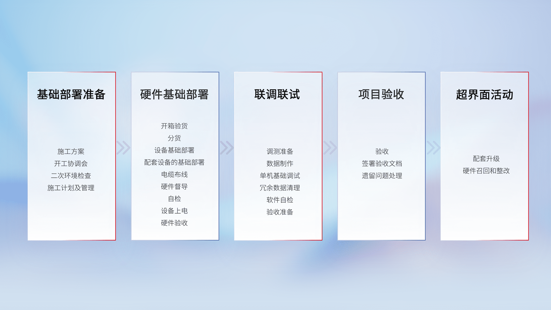 从基础部署准备、、、、硬件基础部署、、、联调联试、、、项目验收、、越界面活动的全过程可追溯,,保证施工质量和进度。。。。